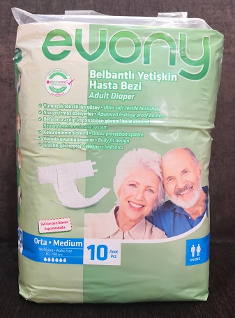 پوشک بزرگسال چسبی ایوونی درسه سایز مدیوم و لارج و ایکس لارج تهیه و تولید گردیده است، سایز مدیوم این پوشک مناسب برای افراد با دور کمر 80 الی 130 سانتی متر می باشد و در هر بسته 10 عدد پوشینه چسبی موجود است. کارتن های پوشک چسبی ایونی حاوی 6 بسته پوشک می باشد.